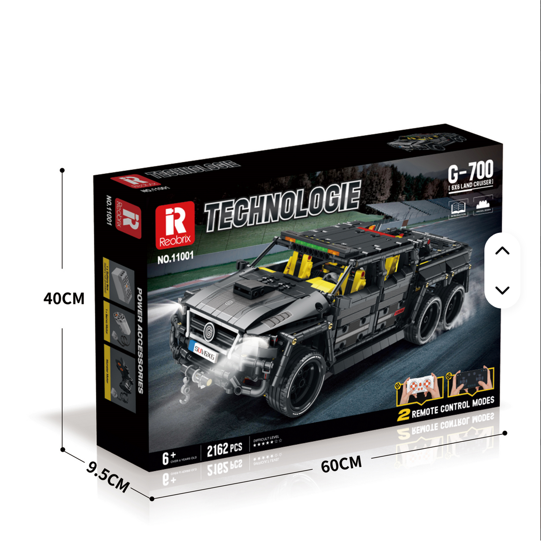 Roțile uriașe 6×6, elementele definitorii ale G700, sunt recreate cu detalii impresionante, ilustrând tehnologia care permite vehiculului să navigheze prin noroi, nisip sau stânci abrupte, reducând rezistența și oferind tracțiune record. Interiorul modular și cockpit-ul detaliat adaugă realism, cu comenzi și elemente structurale care imită configurația reală a monster-truck-ului, completate de control RC prin aplicație sau telecomandă pentru manevre precise și aventuri interactive.