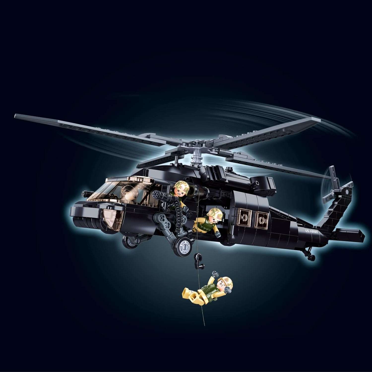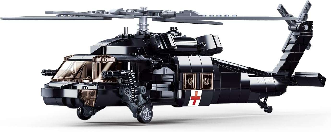 Setul Sluban M38-B1012 surprinde designul robust al Black Hawk, cu elice rotative pliabile, troliu de salvare, tren de aterizare funcțional și cabină accesibilă. Include patru minifigurine (un pilot și trei soldați) cu accesorii, sporind posibilitățile de joc. Construcția, realizată din ABS non-toxic, durează 2-3 ore și este ghidată de instrucțiuni clare. Fără cutie originală în unele cazuri, piesele sunt ambalate în pungi de spumă sau carton.