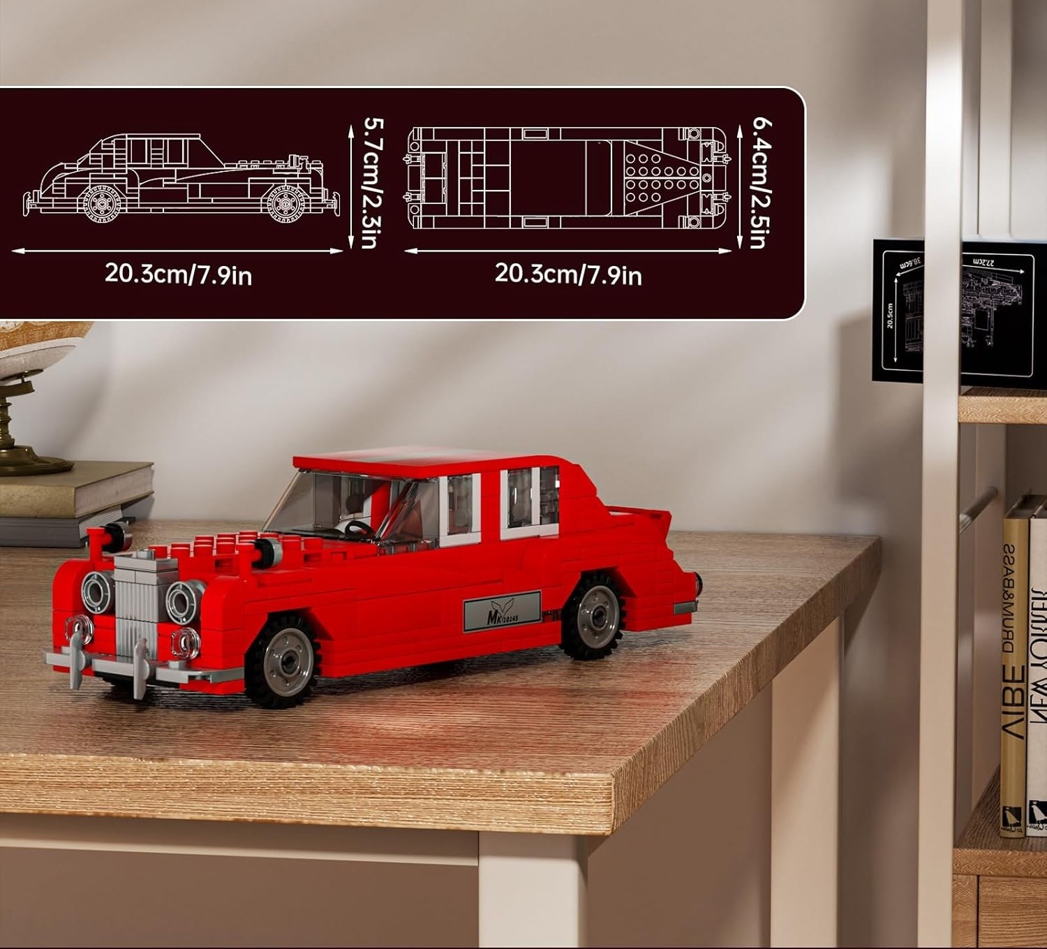 Fabricat din material ABS de înaltă calitate, setul asigură durabilitate și precizie, fiecare piesă fiind proiectată să se îmbine perfect datorită sistemului auto-blocant. Printre caracteristicile notabile se numără capota detașabilă, care dezvăluie un motor detaliat, și un interior realist, cu volan, scaune și alte elemente fin lucrate. Ușile funcționale adaugă un plus de interactivitate, permițând explorarea fiecărui aspect al mașinii. Modelul finit măsoară aproximativ 19 cm lungime, 8 cm lățime și 6 cm înălțime, fiind dimensiunea ideală pentru expunere pe raft sau în vitrine.